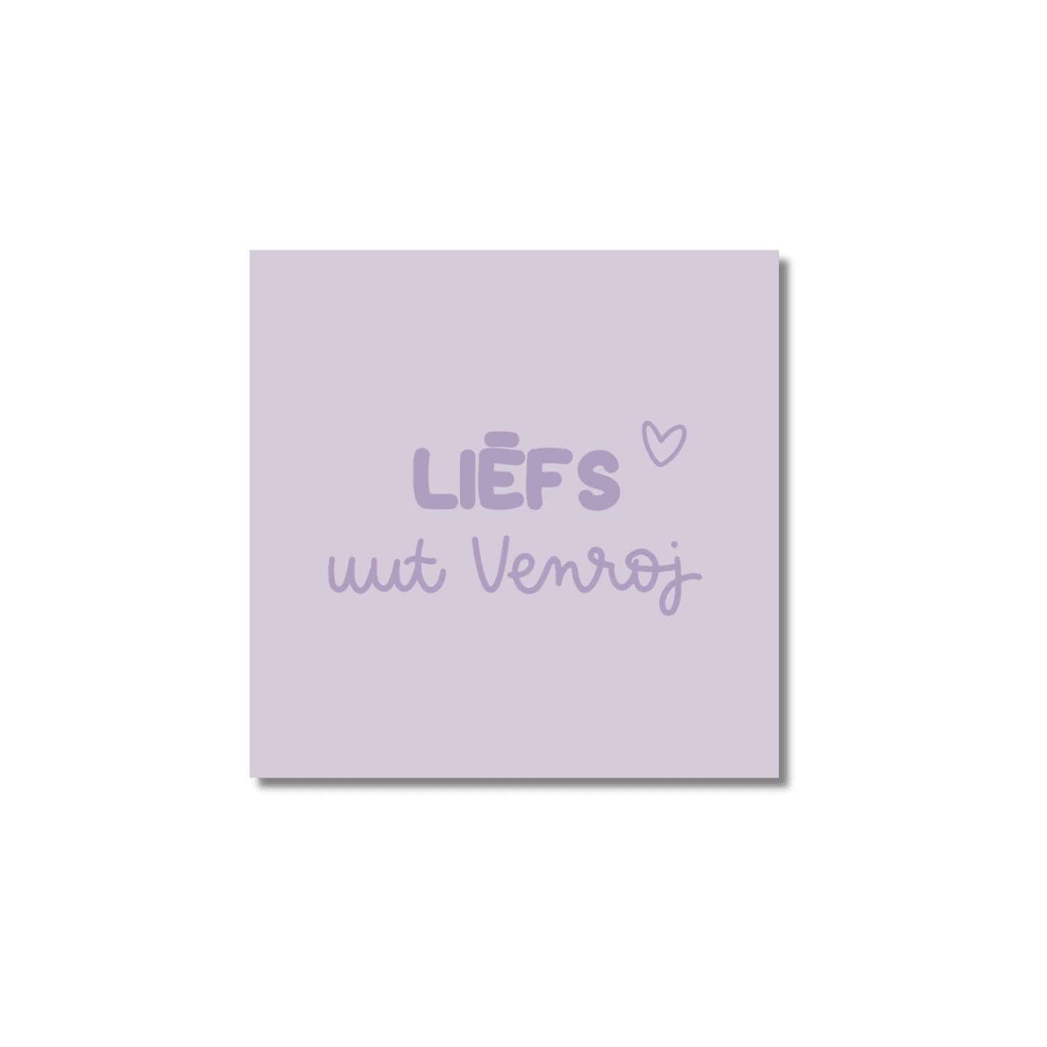 Ansichtkaart met de tekst ‘Liēfs uut Venroj’ is Venrays dialect voor ‘Liefs uit Venray’. Een leuk kaartje vanuit jouw woonplaats die voor veel gelegenheden kan, bijvoorbeeld als je iemand een hart onder de riem wilt steken, gewoon de groetjes wilt doen of wil laten weten dat je aan diegene denkt.