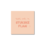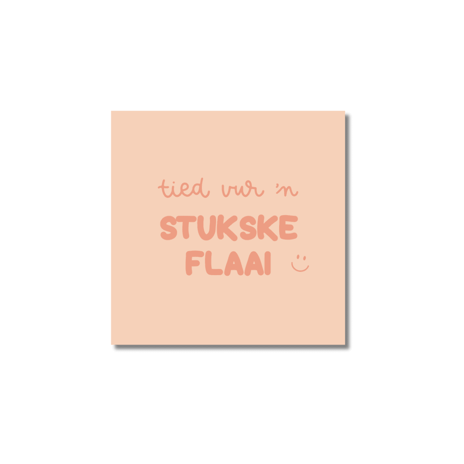 Ansichtkaart met de tekst ‘Tied vur ’n stukske flaai’ is Venrays dialect voor ‘Tijd voor een stukje vlaai’. Vlaai hoort erbij hier in Limburg, zeker als er iets te vieren valt! Dat maakt dit kaartje zo leuk, te gebruiken voor verschillende gelegenheden.