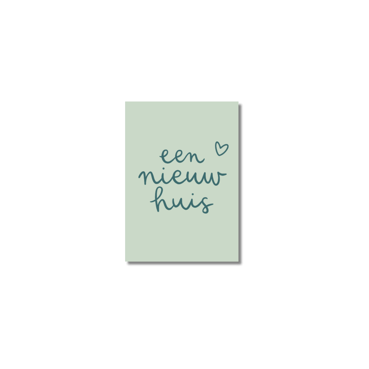 Minikaartje met de tekst ‘Een nieuw huis’. Het origineel is handgeschreven en -getekend.