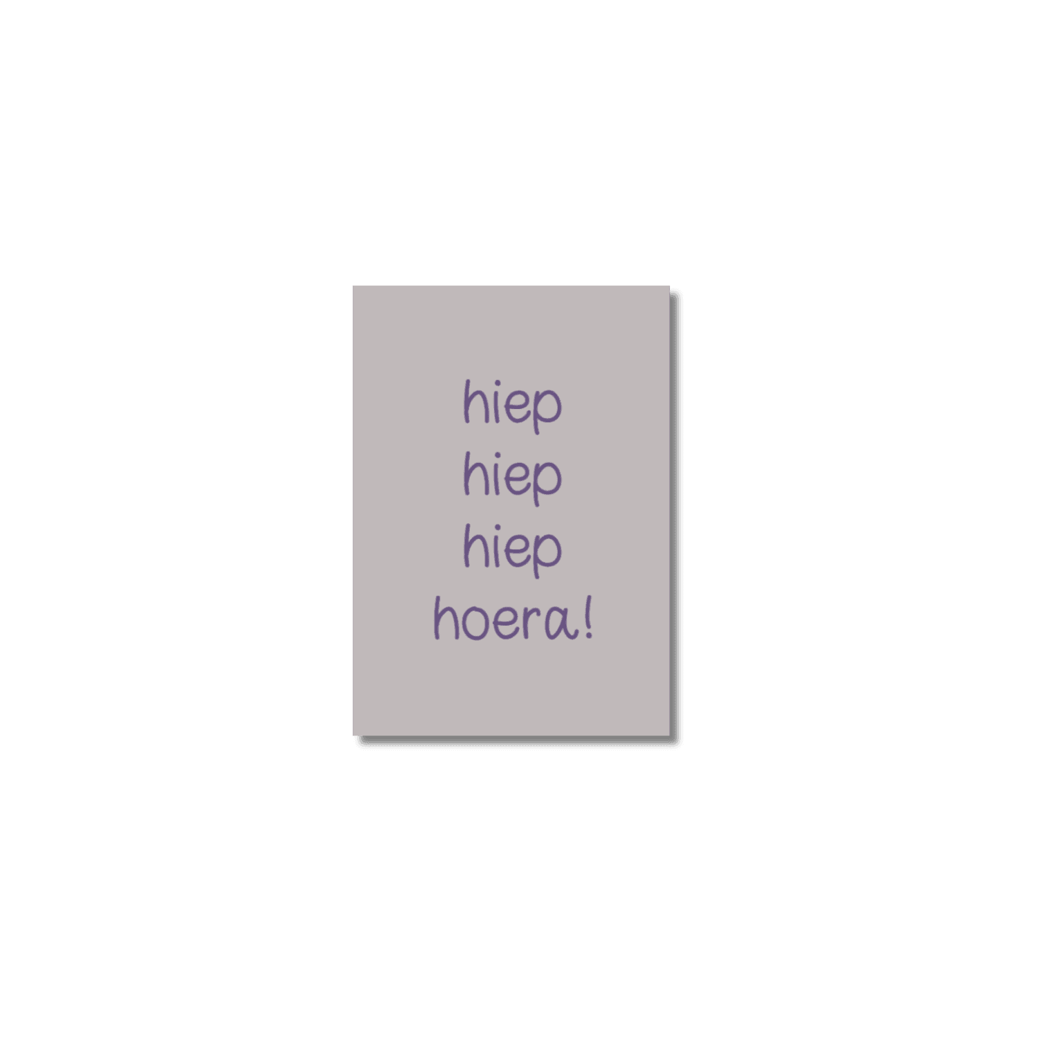 Minikaartje met de tekst ‘Hiep hiep hiep hoera!’. Het origineel is handgeschreven en -getekend.