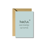 Dubbele kaart met de tekst ‘Hoera, een kleintje op komst’ inclusief envelop. Het origineel is handgeschreven en -getekend.